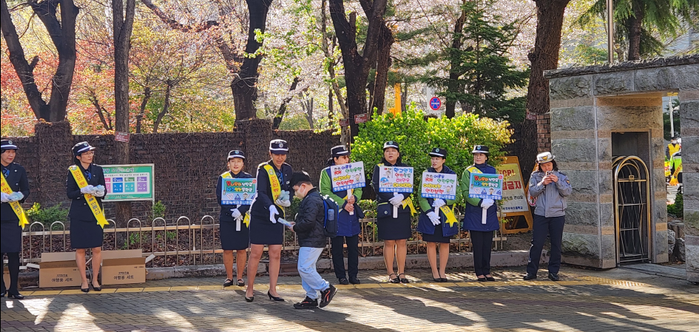 참여자들은 등굣길 어린이들의 교통안전 의식을 높이기 위해 ‘서다, 보다, 걷다’의 보행 3원칙을 홍보했다.