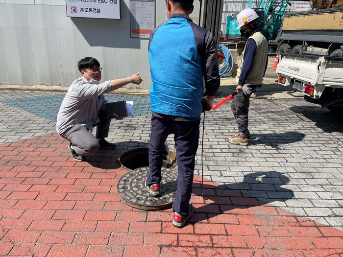 | ▲ 점검반이 대형공사장 주변 하수시설물을 점검하고 있다. (사진=성동구청 제공) |