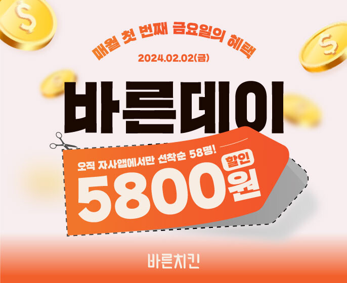 바른데이 당일 바른치킨 앱을 통해 방문포장 주문 시 할인을 받을 수 있다. 앱 상단에 노출된 5,800원 할인쿠폰을 다운받고 결제 과정에서 적용 시 저렴한 가격으로 치킨을 맛볼 수 있다. 1인 1회 사용 가능하며 각 매장당 선착순 58명만 쿠폰을 다운받아 이용할 수 있다.