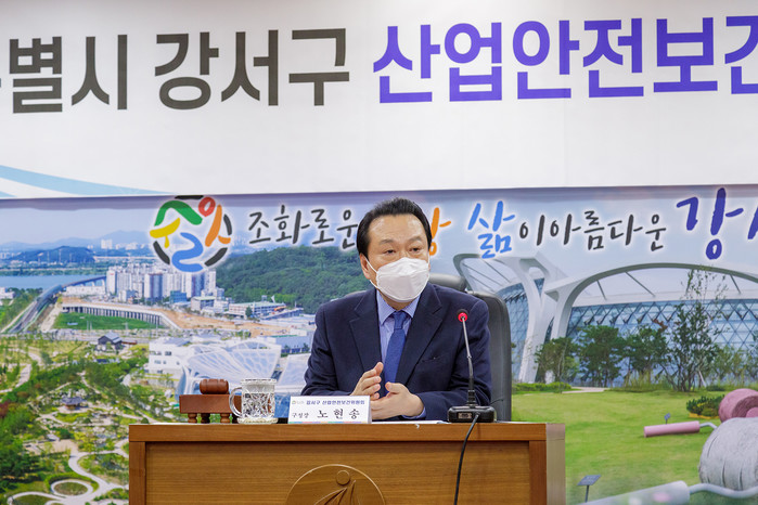 서울 강서구는 29일 산업재해 예방·관리를 위한 ‘강서구 산업안전보건위원회’를 발족하고, 제1차 회의를 열어 강서구 안전보건관리규정 제정 등의 안건을 심의·의결했다. 사진은 강서구 산업안전보건위원회 회의에서 노현송 구청장이 발언하고 있는 모습. (사진제공=강서구청)