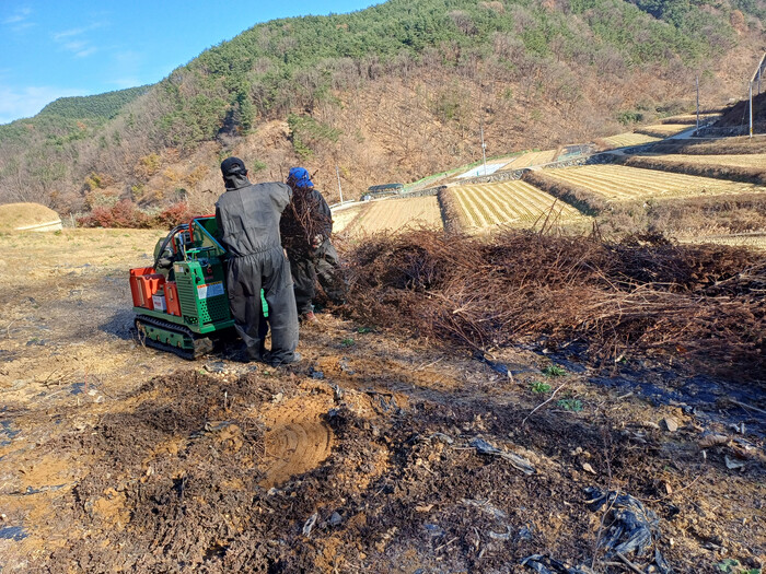 이번 파쇄작업은 가을철 산불예방 기간(11.1 ~ 12.25)을 맞아 마을별 순차적으로 이루어지며, 산불 기동감시원 및 수거요원들이 산림인접지 및 농지의 영농부산물을 파쇄기를 이용해 안전하게 처리하고 불법소각으로 인한 산불 위험을 미연에 방지하고자 실시되었다.