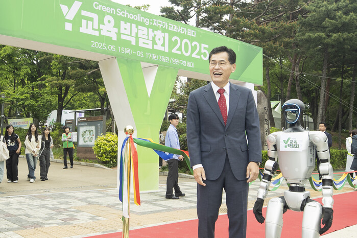 서울 양천구가 최근 6만5000여명의 방문객이 다녀간 가운데 ‘Y교육박람회 2025’를 성공적으로 마무리했다. 이번 박람회는 ‘그린스쿨링(Green Schooling), 지구가 교과서가 되다’를 주제로 자연과 환경 중심의 교육 패러다임을 제시하며 기후위기 시대에 대응하는 미래교육 모델을 새롭게 선보였다. 사진은 박람회에서 이기재 구청장과 휴머노이드 Y로봇이 함께 있는 모습. (사진=양천구청 제공)