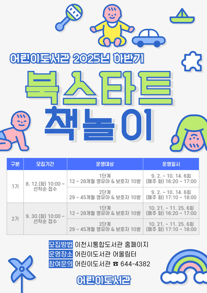 [시민일보 = 민장홍 기자] 경기 이천시 어린이도서관이 오는 9월2일부터 ‘2025년 하반기 북스타트 책놀이’ 프로그램을 운영한다고 밝혔다.