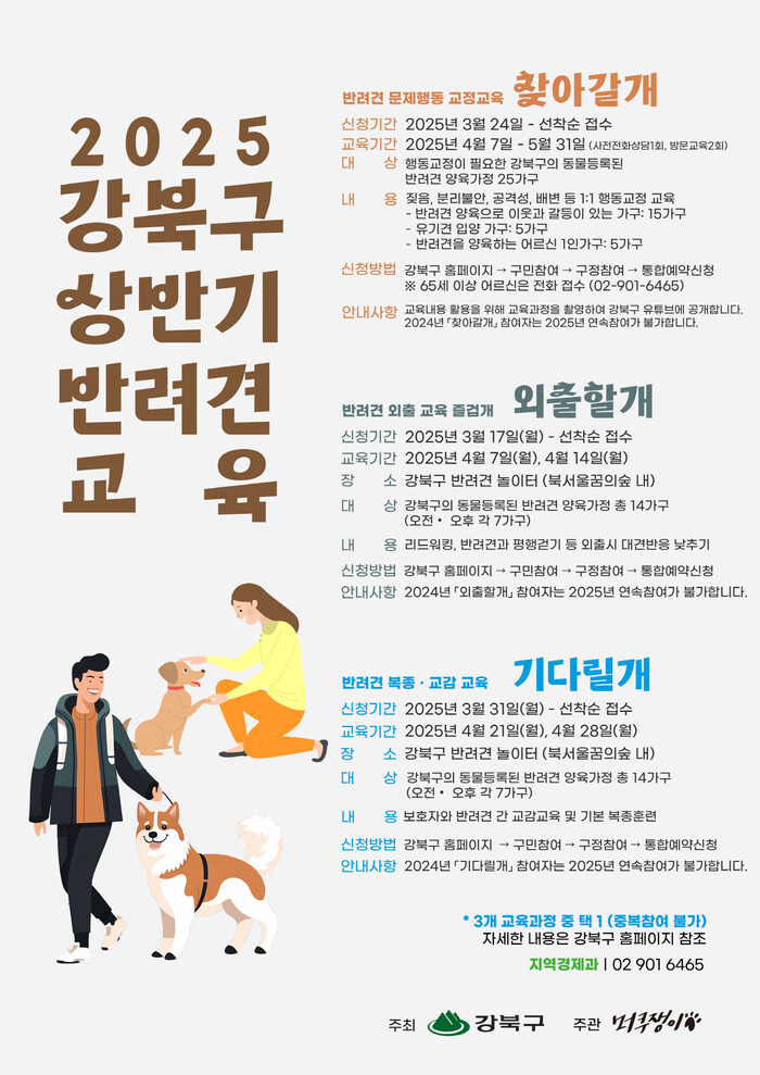 [시민일보 = 문민호 기자] 강북구(구청장 이순희)는 반려견의 문제행동으로 어려움을 겪는 구민을 위해 2025년 상반기에도 맞춤형 행동 교정 프로그램을 운영한다고 5일 밝혔다.