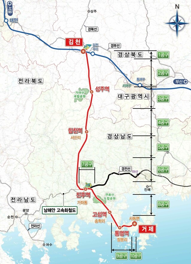 남부내륙철도 건설사업은 김천에서 거제까지 178㎞ 구간에 철도를 신설하는 사업으로 완공 시 김천역에서 서울역까지 1시간 10분, 김천역에서 거제까지는 1시간 30분 만에 고속열차로 이동할 수 있어, 김천시 관광 활성화 및 지역발전에 크게 기여할 것으로 기대된다.