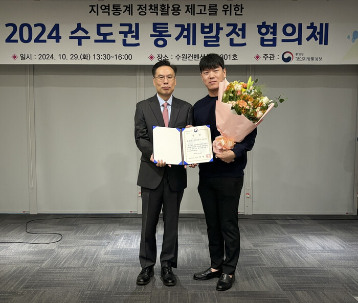 | ▲ ‘지역통계 우수사례 공모전’에서 장려상 수상 후 기념 촬영하는 서울 동대문구 스마트도시과 직원(사진 오른쪽)과 안형익 경인지방통계청장(사진 왼쪽). (사진=동대문구청 제공) |