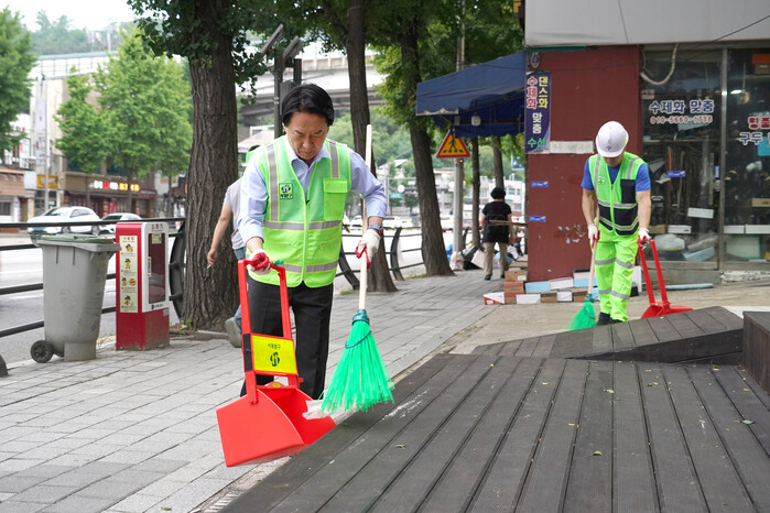 이성헌 서울 서대문구청장이 민선8기 후반기 첫날인 1일 새벽 관내 인왕시장길을 찾아 거리 청소를 하고 있다. 이 구청장은 2년 전이었던 민선 8기 첫날 새벽 첫 일정으로도 같은 곳에서 청소 작업을 펼친 바 있다.