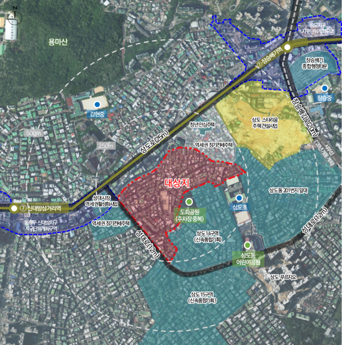 상도동 242번지 일대 모아타운은 약 6만9120㎡ 규모로 지하철 7호선 신대방삼거리역과 장승배기역 인근에 위치해 교통 접근성이 뛰어난 지역이다.