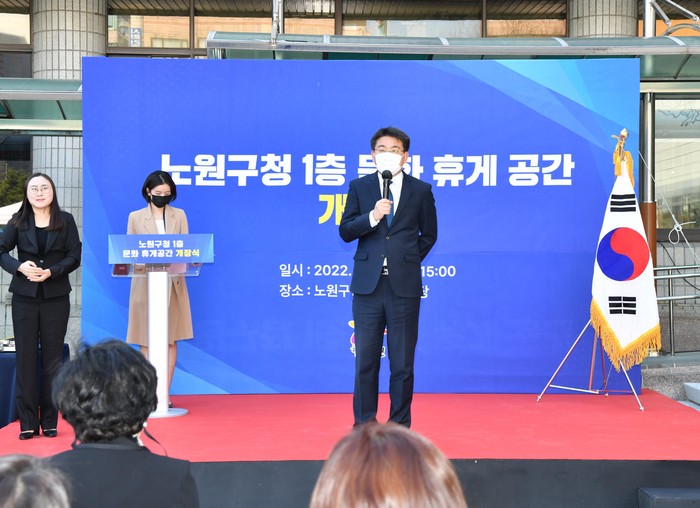 서울 노원구는 지난 28일 ‘구청사 1층 문화 휴게공간 개장식’을 진행했다. 주요시설로는 2500여권의 책을 갖춘 열린도서관, 북카페, 어린이 책놀이터 등이 있다. 사진은 개장식에서 오승록 구청장(오른쪽)이 축사를 하고 있는 모습. (사진제공=노원구청)