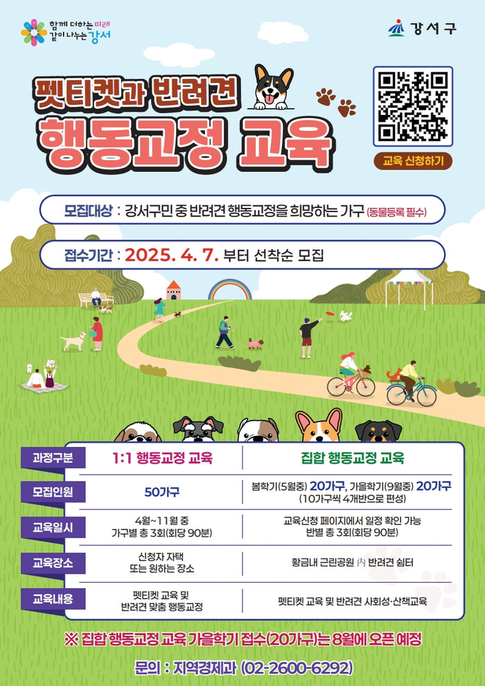 ‘집합 행동교정’은 반려견 사회성 향상과 산책교육, 펫티켓 교육으로 구성되며, 황금내근린공원(허준로 221-40) 내 반려견 쉼터에서 실시된다.