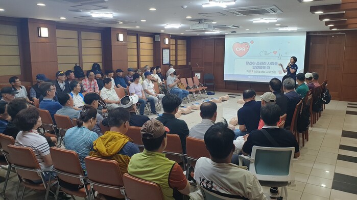 현업 근로자란 시설물 경비, 공원‧녹지 유지관리, 환경미화, 산림조사 및 보호, 조리 등을 수행하는 근로자를 말한다. 구는 이들이 주로 사고 위험이 큰 환경에서 일하는 점을 고려해 심폐소생술, 자동심장충격기(AED) 사용법 등을 자세하게 알려줬다. 응급상황 발생 시 사람의 생명을 신속하게 구할 수 있는 능력을 갖추도록 실습 위주로 이뤄졌다.
