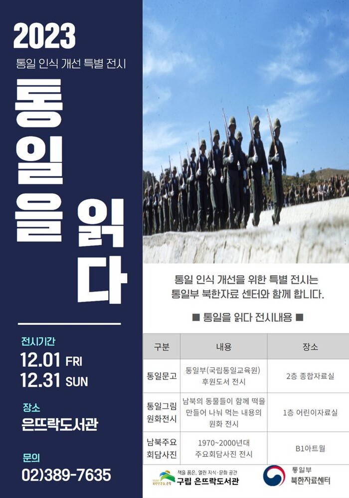 [시민일보 = 이대우 기자] 서울 은평구(구청장 김미경)는 구립은뜨락도서관에서 연말 특별전시 ‘통일을 읽다’를 오는 31일까지 운영한다고 밝혔다.