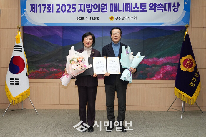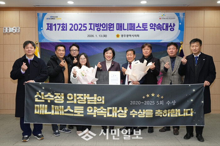 [광주=정찬남 기자] 광주광역시의회 신수정 의원이 “2025년 지방의원 매니페스토 약속대상” 좋은조례 분야에서 최우수상을 받았다.