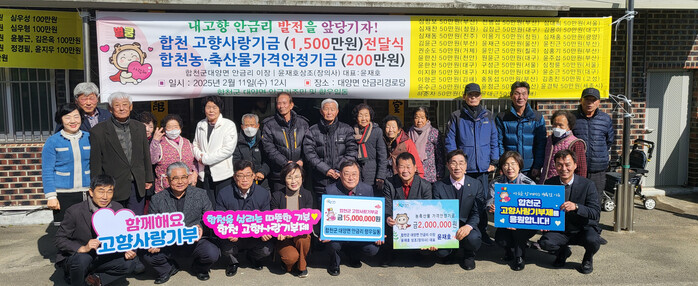 대양면 안금리(이장 윤재호 전 합천군의회 재선의원)는 11일 정오 안금경로당에서 윤재호 이장의 농축산물가격안정기금 200만원과 향우들이 모은 1500만원을 합천고향사랑기부금을 김윤철 합천군수에게 전달했다.