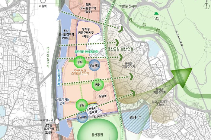 주된 내용은 ▲한강대로변 도심기능 연계를 위한 권장용도 도입 ▲저층 노후주거지 환경개선을 위한 특별계획구역 조정과 기반시설 배치 ▲용산공원~남산 녹지·보행축 연계와 가로 활성화 등을 담고 있다.