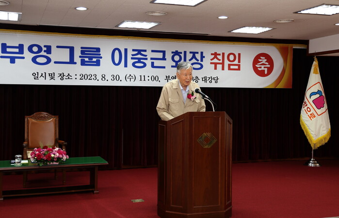 | ▲ 30일 열린 취임식에서 이중근 회장이 인사말을 전하고 있다. (사진=부영그룹 제공) |