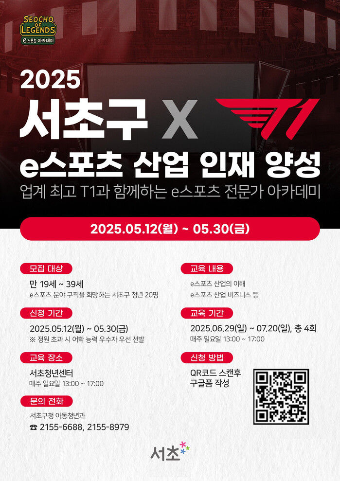 [시민일보 = 박소진 기자] 서초구(구청장 전성수)가 세계적인 e스포츠 팀 T1이 설립한 e스포츠 전문교육기관 ‘T1 아카데미’와 협력해 이 분야 전문 인재 양성에 나선다.