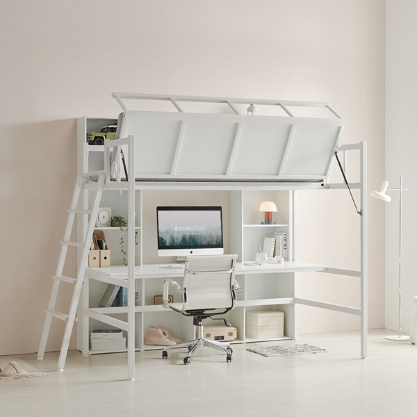 한눈에 보는 폴딩 리프트업 벙커침대로, 낮에는 사무 공간, 밤에는 편안한 침대로 사용 가능하다. 또한, 매트리스를 반으로 접는 폴딩 시스템으로 넓은 공간 확보가 가능하고, 침대 하부, 밝고 쾌적한 디자인을 적용하고, 머리 부딪힘 방지로 안전성을 강화해 좁은 공간에서도 넉넉한 생활이 가능하다.