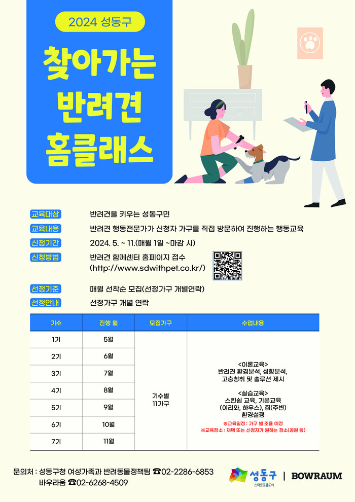 [시민일보 = 변은선 기자] 성동구(구청장 정원오)는 올바른 반려동물 돌봄 문화 조성을 위해 오는 11월까지 ‘찾아가는 반려견 홈클래스’를 운영한다.