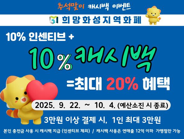 [화성=송윤근 기자] 경기 화성시가 추석 명절을 맞아 22일부터 10월4일까지 ‘희망화성지역화폐 특별 캐시백 이벤트’를 운영한다.