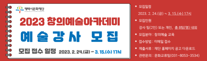 [평택=오왕석 기자] 재단법인 평택시문화재단(대표이사 이상균)이 2023년 새 학기를 맞아 평택형 창의예술교육 ‘2023 창의예술 아카데미’예술강사를 모집한다.