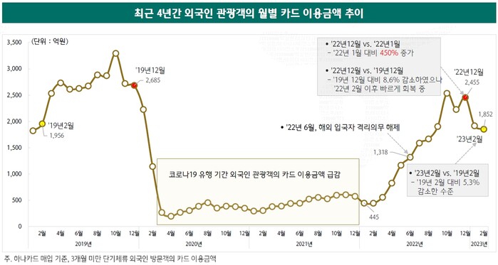 하나카드에 따르면 지난 2022년 한 해 동안 단기체류 외국인의 카드 이용금액이 4배 이상 증가함에 따라 코로나19 유행으로 침체되었던 외국인 관광객의 소비가 빠르게 회복되고 있는 것으로 나타났다.
