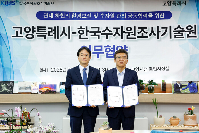 경기 고양시와 한국수자원조사기술원이 29일 고양시청 열린시장실에서 ‘하천 환경보전 및 수자원 관리를 위한 업무협약’을 체결했다. 이번 협약은 시민들이 안전하게 즐길 수 있는 친수공간 조성과 하천 재해예방 체계 구축을 위해 양 기관의 인적·물적 자원을 공유하고 협력하는 것을 목적으로 한다. 사진은 협약식에 참석한 이동환 시장(왼쪽)이 이영기 원장과 기념촬영을 하고 있는 모습. (사진=고양시청 제공)
