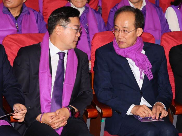 또 추 원내대표는 "민주당이 대한민국 사법부를 너무 우롱하며 무시하는 것 같다"며 "한편에서는 대규모 장외집회, 판사 탄핵 협박 국회의원 서명 릴레이, 무죄 탄원서 등에 이어 야당 지방자치단체장까지 동원해 판사를 겁박하고 있고 다른 한편에서는 내년도 법원 예산을 246억원 늘려 판사를 회유하려 한다"고 말했다.