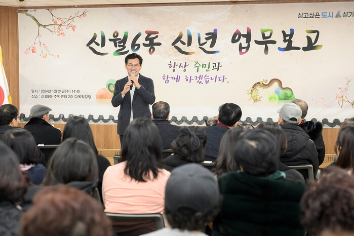 | ▲ 지난달 진행된 신년 동 업무보고회에서 구민과 소통중인 이기재 구청장. (사진=양천구청 제공) |