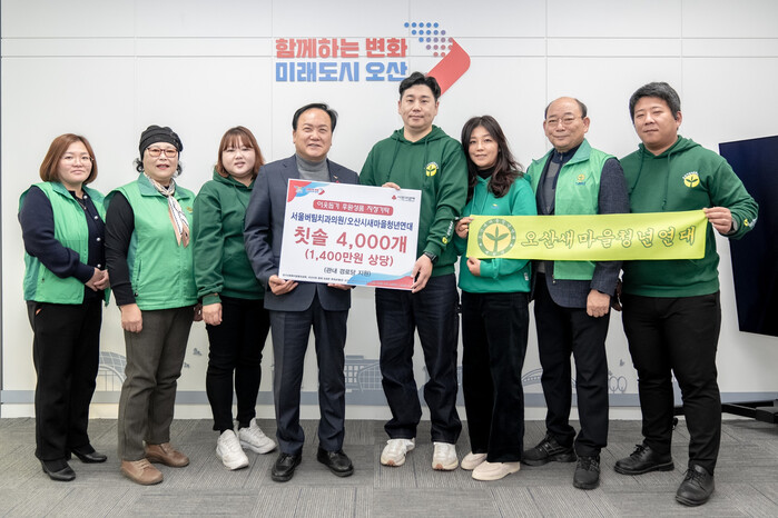 경기 오산시가 13일 서울버팀치과의원으로부터 지역내 취약계층 노인 지원을 위한 성인용 칫솔 4000개(1400만원 상당)를 기부받았다. 사진은 기탁식에서 이권재 시장(왼쪽 네 번째)이 관계자들과 기념 촬영을 하는 모습. (사진=오산시청 제공)