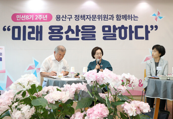 | ▲ 최근 박희영 구청장(가운데)가 구청 10층 북카페에서 미래 용산을 말하다 정책자문위원회 간담회에 참석한 모습. (사진=용산구청 제공) |