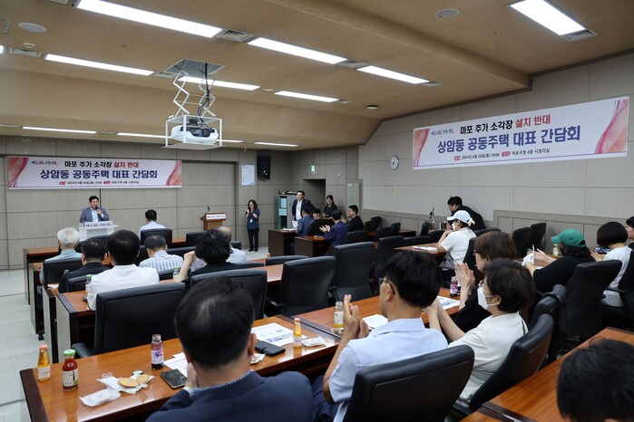 서울 마포구는 지난 26일 상암동 아파트 단지 관계자들과 소각장 건립 저지를 위한 정책 간담회를 열었다. 사진은 이날 박강수 구청장이 소각장 추가건립 반대 정책 간담회에서 참석한 주민들과 소통을 하며, 발언을 하고 있는 모습. (사진=마포구청 제공)