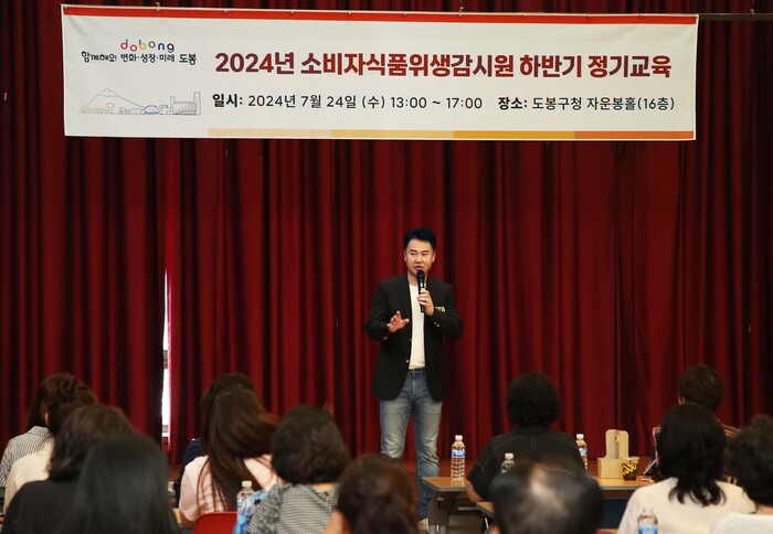 서울 도봉구가 지난 24일 도봉구 소비자식품위생감시원 전원을 대상으로 하반기 정기교육을 실시해 소비자감시원의 임무 및 활동요령 등을 중점으로 교육을 진행했다. 사진은 오언석 구청장이 2024년 소비자식품위생감시원 하반기 정기교육에서 인사말을 하고 있는 모습.(사진=도봉구청 제공)