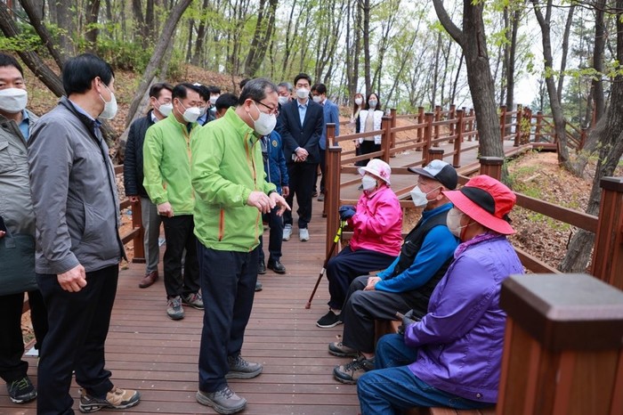 조광한 경기 남양주시장은 18일 화도근린공원 및 늘을중앙공원 조성 현장과 심석고등학교 운동장 공영 주차장 공사 현장을 방문해 각 사업 진행 상황을 점검했다. 사진은 화도근린공원에서 시민들과 대화하고 있는 조 시장(가운데)의 모습. (사진제공=남양주시청)