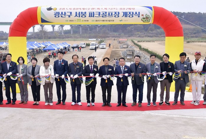 | ▲ 강기정 광주광역시장(왼 쪽부터 8번)이 22일 오전 광산구 서봉파크골프장 개장식에 참석해 정무창 광주시의회 의장, 박병규 광산구청장 등 내빈들과 테이프커팅을 하고 있다./광주광역시 제공 |