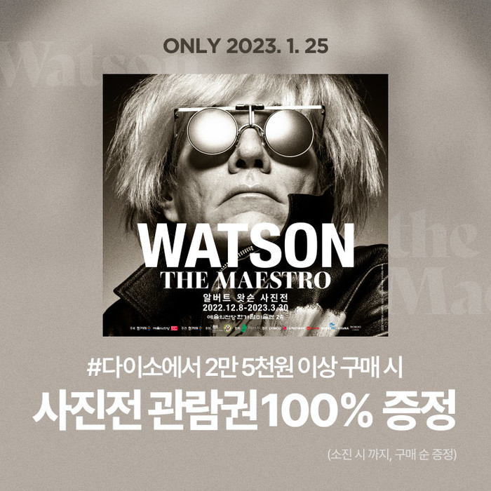 아성다이소에 따르면 이번 이벤트는 모바일 쇼핑앱 샵다이소에서만 진행되며, 오는 25일 단 하루 동안 샵다이소에서 2만 5000원 이상 구매 시 <알버트 왓슨 사진전> 관람권(1인 2매)을 소진 시까지 100% 증정한다.