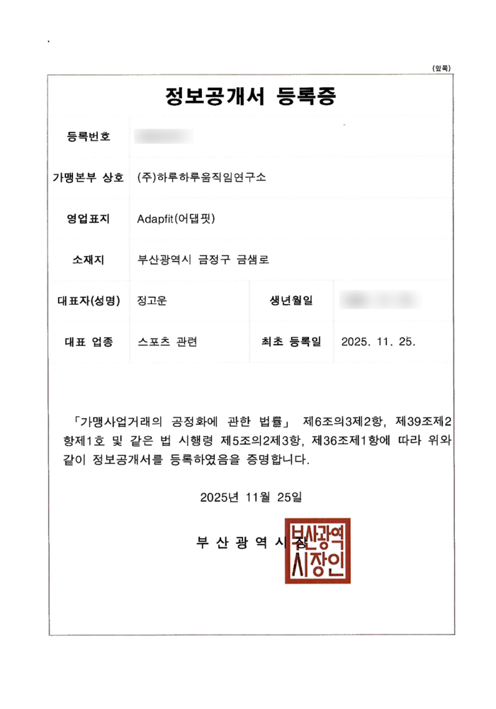 어댑핏은 2020년 설립 이후 만성질환자, 장애인, 고령자 등 건강취약계층을 대상으로 한 맞춤형 운동 서비스를 개발·운영해왔다. 질환·신체 기능 평가에 기반한 운동 처방과 전문 인력 시스템, 배리어프리 환경을 구축하며 국내 질환 특화 디지털 헬스케어 분야에서 현장 중심 모델을 축적해왔다. 이번 정보공개서 발급은 이러한 서비스 표준과 운영 체계가 가맹사업 기준을 충족했음을 공식적으로 인정받았다는 점에서 의미가 있다.