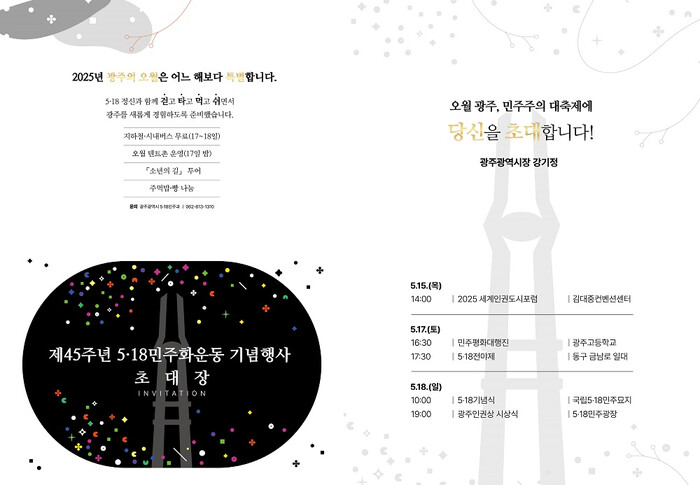 강기정 시장은 “오월광주, 민주주의 대축제에 당신을 초대합니다. 2025년 광주의 오월은 어느 해보다 특별합니다. 5‧18정신과 함께 걷고, 타고, 먹고, 쉬면서 광주를 새롭게 경험하도록 준비했습니다”라며 제45주년 5‧18기념행사에 초청했다.