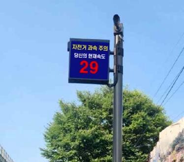 내용은 ‘자전거 접근 중, 자전거 하차, 자전거 안전속도 준수, 자전거 과속 주의, 당신의 현재 속도’ 등이다.