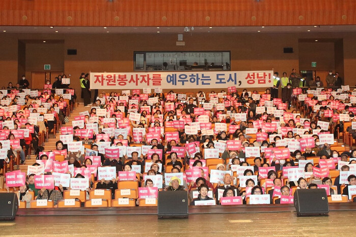 성남시자원봉사센터(센터장 장현자)가 주최한 이 날 기념행사에는 성남시 관내 자원봉사자와 시민 1천7백여 명이 참석해 성황을 이뤘다. 오후 1시 반부터 시작한 식전 축하공연은 성남시립교향악단과 성남시립합창단의 수준높은 연주와 합창공연으로 참석자들을 매료시켰고, 이어서 이주희 성남시연극협회장이 이해인 수녀의 시 ’새롭게 사랑하기‘ 낭송을 마치자 우레와 같은 박수와 함께 이날 행사장 분위기는 한층 고조되었다.