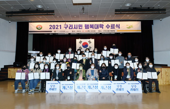 경기 구리시가 최근 ‘2021년 구리시민 행복대학’ 수료식을 개최했다. 시는 지난 4월 구리시민 53명을 공개모집 선발해 5~12월 총 8회차 과정으로 행복에 관한 다양한 주제로 전문가들을 초빙해 진행했다. 사진은 이날 수료자들이 기념촬영을 하는 모습. (사진제공=구리시청)