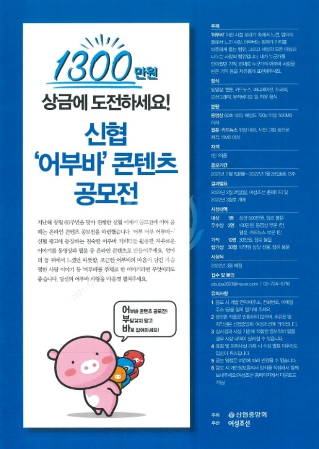 [시민일보 = 여영준 기자] 신협중앙회(이하 신협)가 오는 2022년 1월28일까지 신협 ‘어부바’ 콘텐츠 공모전을 실시한다고 20일 밝혔다.
