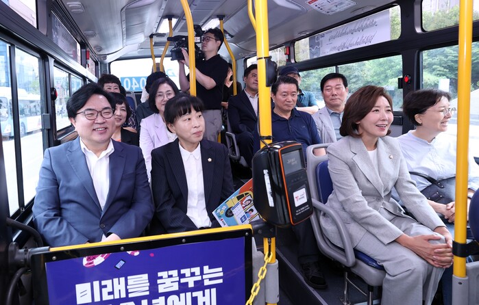 박일하 서울 동작구청장과 나경원 국회의원이 26일 신설 노선인 040번 시내버스(용산차고지-개포동 우성아파트 회차)에서 지역 주민들과 시승식을 하고 있다.