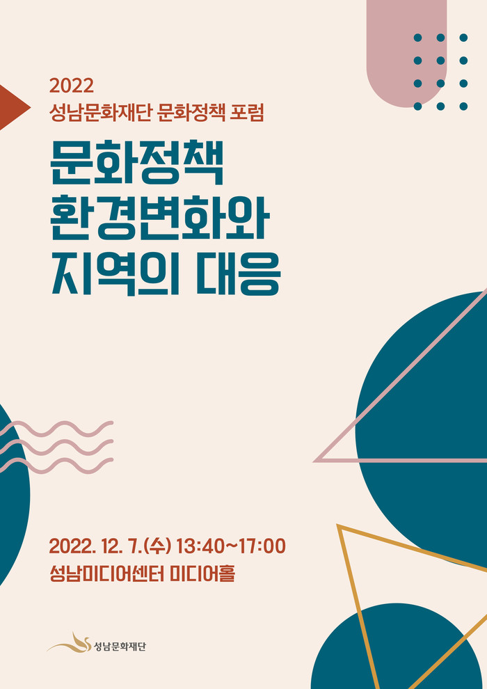 성남문화재단은 이번 포럼이 재단은 물론 시민과 문화예술 관계자 등 지역 문화예술생태계 구성원들이 급변하는 문화정책 변화 속에서 성남만의 문화정책 방향성을 찾아가는 계기가 되길 기대하고 있다.