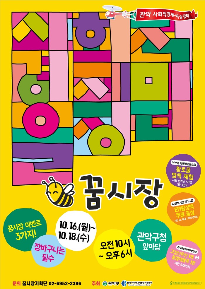 [시민일보 = 여영준 기자] 관악구(구청장 박준희)는 16~18일 오전 10시~오후 6시 구청 광장에서 대표적 사회적경제장터인 ‘꿈시장’을 연다고 밝혔다.