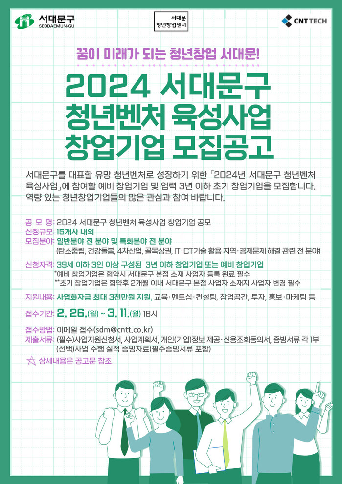모집공고일(2월26일) 기준 서대문구에서 창업의지가 있는 39세 이하 청년 3인 이상으로 구성된 업력 3년 이하 초기 창업기업 또는 예비 창업기업은 서대문구 홈페이지 고시공고 및 서대문청년창업센터 공식블로그를 참고해 3월 11일까지 신청하면 된다.