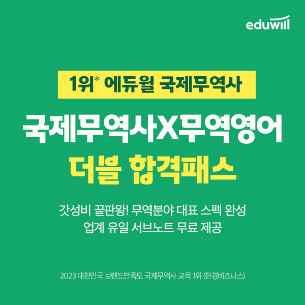 [시민일보 = 여영준 기자] 에듀윌은 국제무역사 및 무역영어 전강좌를 수강할 수 있는 ‘더블 합격패스’ 수강생을 대상으로 ‘에듀윌 무역자격증 서브노트’ 무료 제공 이벤트를 진행한다고 7일 밝혔다.