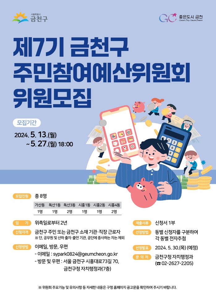 [시민일보 = 여영준 기자] 금천구(구청장 유성훈)는 구민을 대표해 예산편성 등 과정에 직접 참여할 ‘제7기 금천구 주민참여예산위원회 위원’을 오는 27일까지 모집한다고 밝혔다.