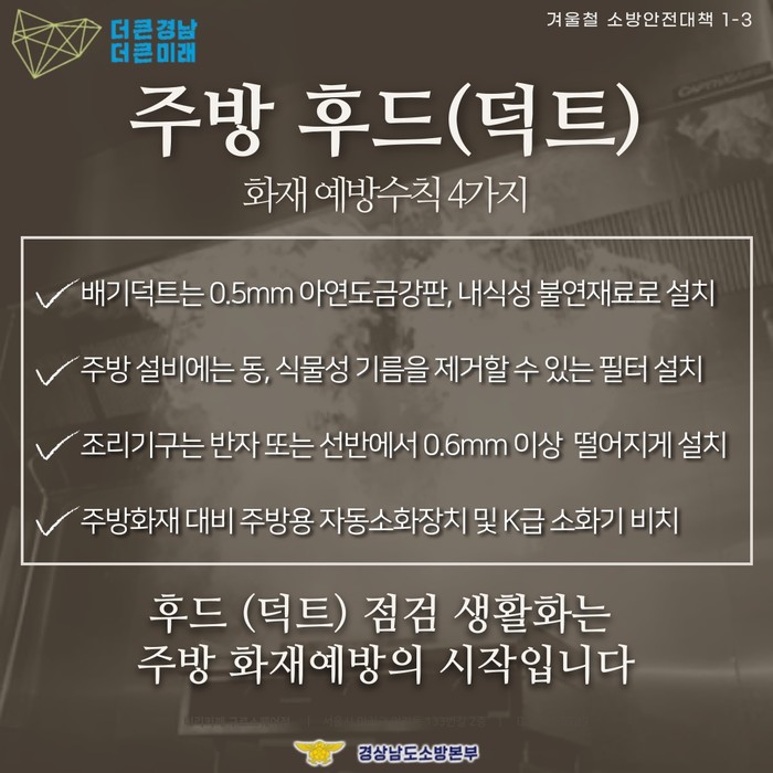 후드ㆍ덕트 화재를 예방하기 위해선 ▲배기 덕트를 0.5㎜ 이상 강판 등 불연재로 설치 ▲기름을 제거할 수 있는 필터 설치 ▲ 주방 후드 및 배기 덕트 기름 찌꺼기 정기적 청소 등이 필요하다. 또 화재를 대비해 주방용(K급) 소화기도 함께 비치해야 한다.