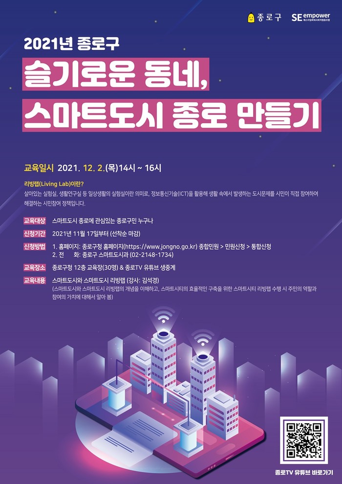 이날 교육은 ▲‘스마트도시’란 어떤 도시인가? ▲스마트도시 주요 특징 ▲주민이 만들어 나가는 똑똑한 도시 ▲종로 스마트도시 리빙랩 등의 주제로 진행될 예정이다.